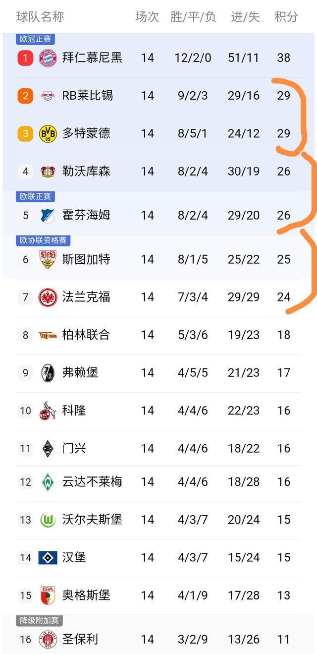 莱比锡和多特都是积29分,可以说莱比锡和多特蒙德处于第二集团,他们处于争夺欧冠席位的有利位置,而勒沃库森和霍芬海姆、斯图加特、法兰克福处于第三集团。可以看到第2和第7的分差仅4分,莱比锡、多特、勒沃库森、霍芬海姆、斯图加特、法兰克福这些球队将争夺三个欧冠席位,所以除了冠军几乎没有悬念之外,欧冠席位的争夺还是很有悬念的。看德甲也就是看谁能拿到欧冠席位。因为欧冠席位的争夺异常激烈啊。