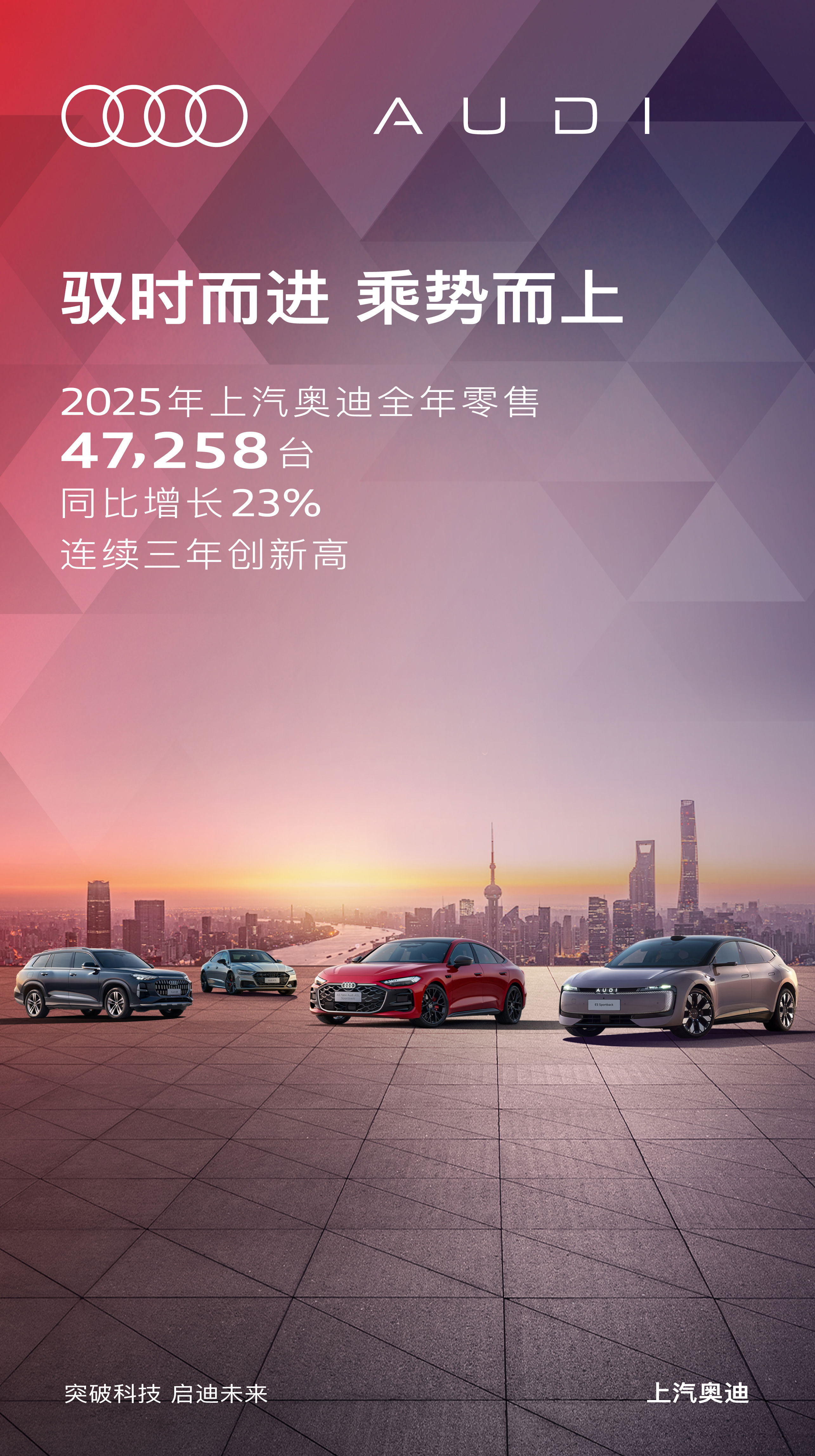 2026年1月1日,上海–上汽奥迪2025年全年零售达47,258台,同比增长23%,实现年度销量稳健三连涨,展现出强劲的市场发展势能。持续向好的增长态势,得益于产品矩阵的高效焕新与精准布局。2025年,上汽奥迪接连推出两款重磅新车,全新上汽奥迪A5LSportback作为全球首款搭载华为乾崑技术的燃油车,率先开启智能豪华燃油车新赛道;奥迪E5Sportback则深度融合德系豪华基因与中国智能科技,为追求高品质电动出行的用户带来全新选择。