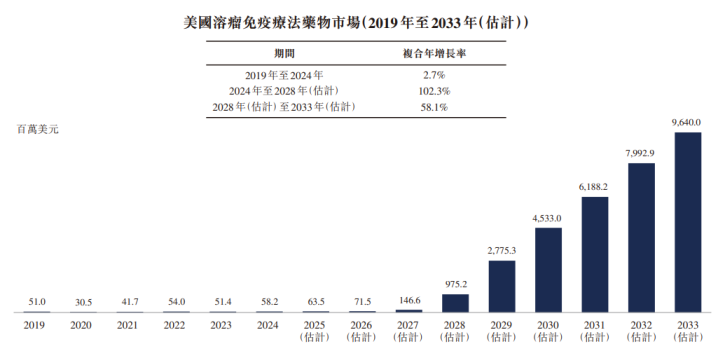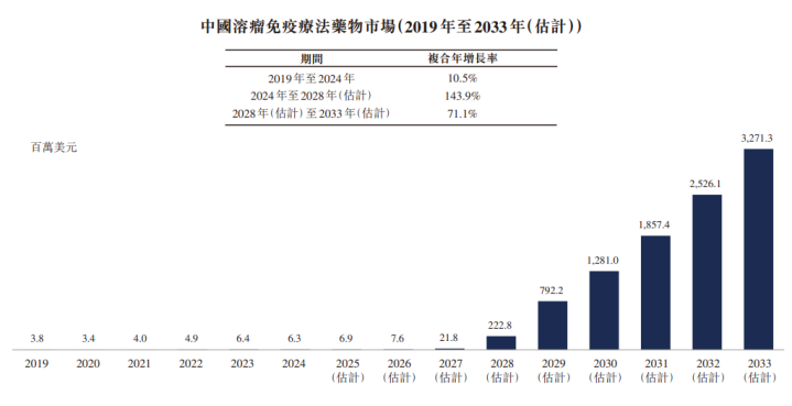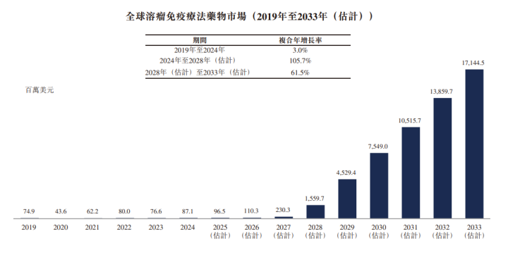 中国在溶瘤免疫疗法领域的发展势头亦堪称迅猛。根据弗若斯特沙利文的资料,2025年至2033年间中国预期至少将有六款新型溶瘤免疫疗法获批上市,其适应症范围同样亦会扩展至覆盖更多实体瘤类型。此等动态共同预示中国溶瘤病毒药物市场将迎来显著增长,预计该市场规模将由2024年的630万美元增长至2028年的2.23亿美元,并于2033年进一步攀升至32.71亿美元,2024年至2028年间复合年增长率高达143.9%,2028年至2033年间则为71.1%。